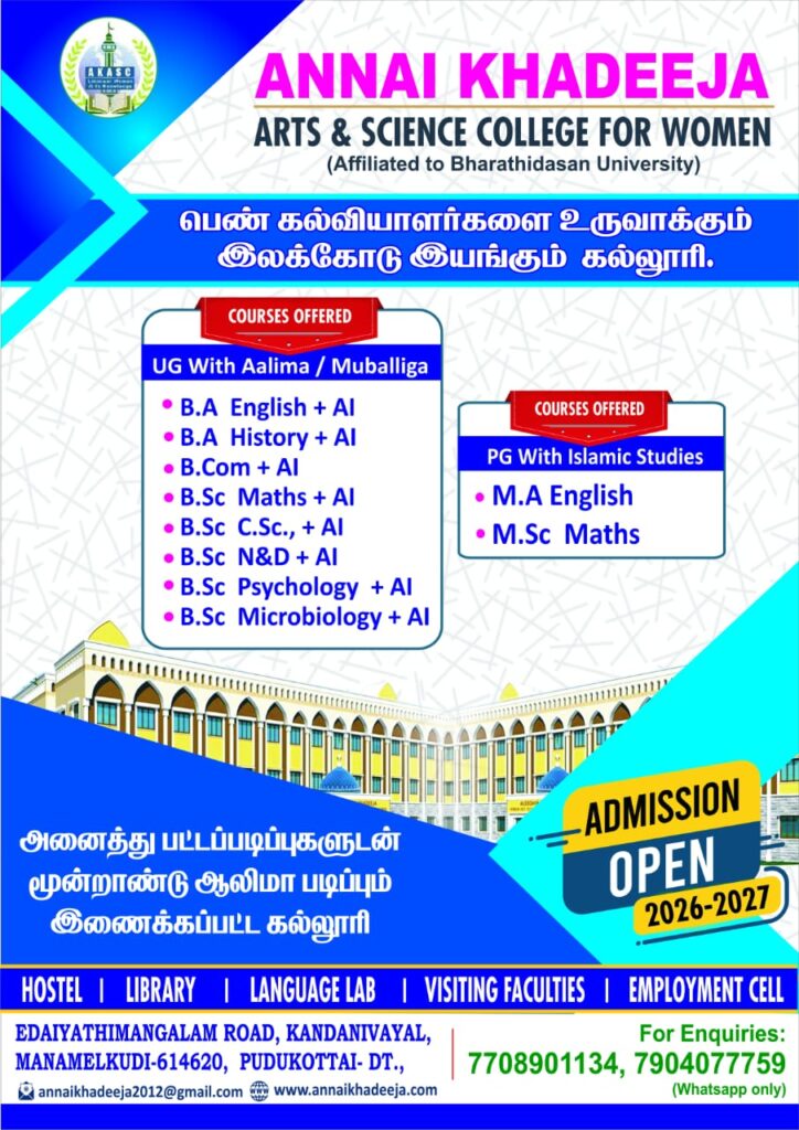 உங்கள் பெண் பிள்ளைகளுக்கு கல்வியையும் கலாச்சாரத்தையும் ஒருசேர கற்பிப்பதற்கான பொறுப்பை அன்னை கதீஜா கலை அறிவியல் மகளிர் கல்லூரி ஏற்றுள்ளது.