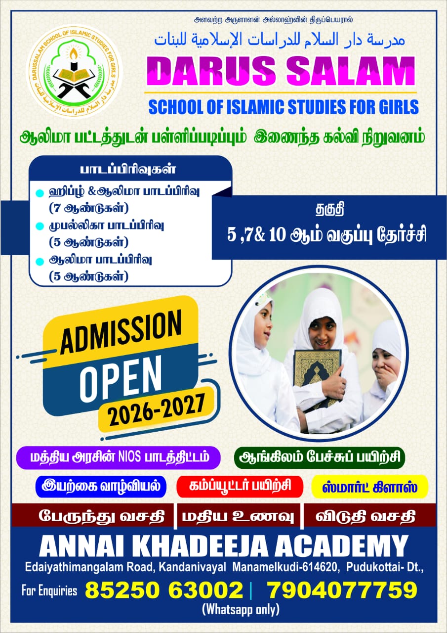 அன்னை கதீஜா அகாடமி சார்பில் DARUS SALAAM SCHOOL OF ISLAMIC STUDIES FOR GIRLS என்ற இஸ்லாமியக் கல்வி கற்பிக்கும் பள்ளிக்கூடம் கடந்த 2015 கல்வியாண்டு முதல் நடைபெற்று வருகிறது.
